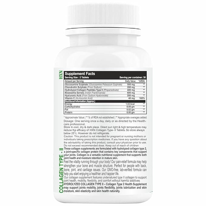 - HXN Collagen Type 2 Supplement is a powder protein peptide designed with hydrolyzed collagen and vitamin C, along with glucosamine, chondroitin, hyaluronic acid, and boswellia serrata extract. This formula supports overall wellness and is suitable for daily use