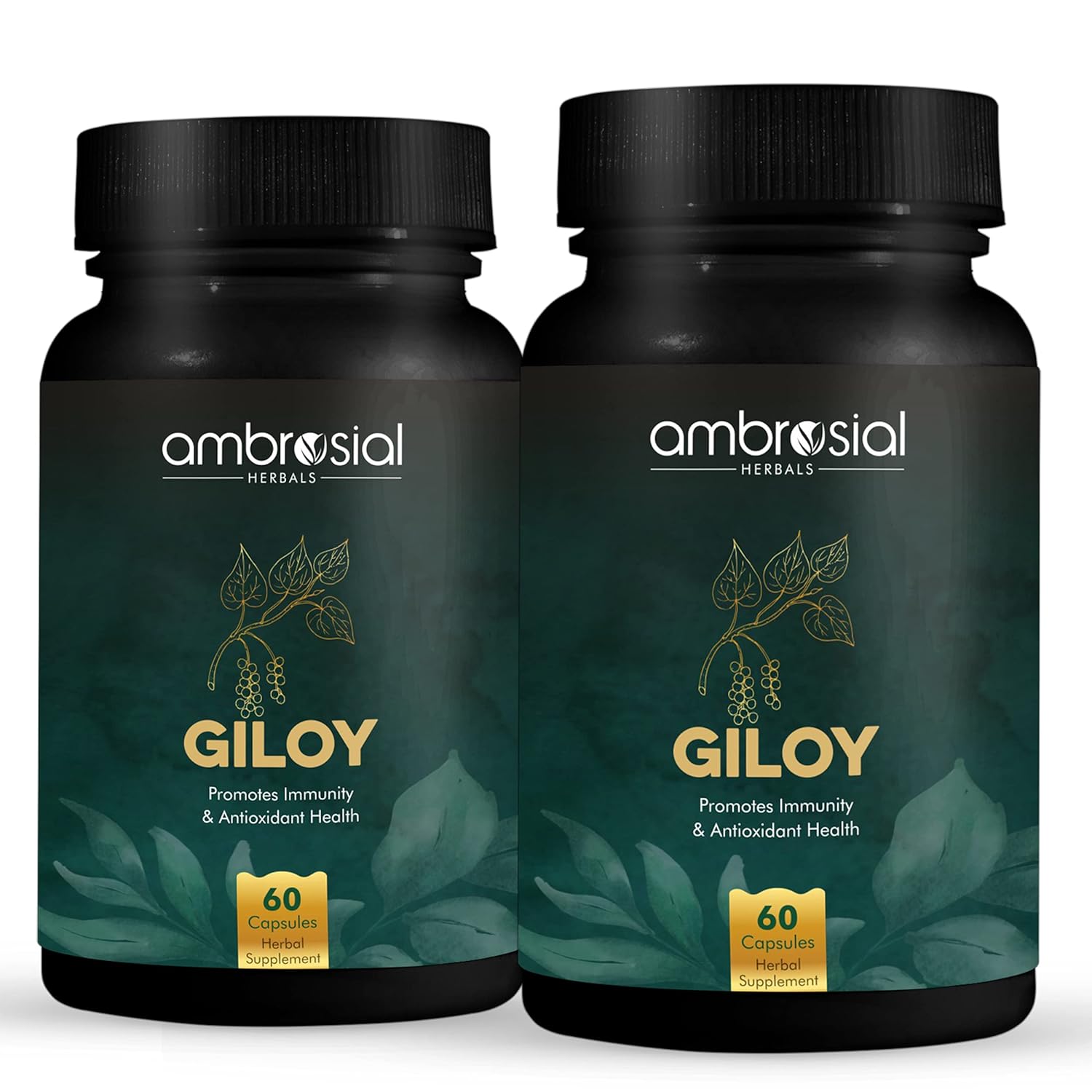 • WHY AMBROSIAL GILOY: Ambrosial Veg Giloy capsules are made from Giloy Stem & Leaf Extract providing 100% natural & pure Giloy extract for maximum results. Giloy also known as Guduchi or Tinospora Cordifolia is premium herbal supplement for immunity & general well-being. Each Capsule provides 500mg of Giloy.