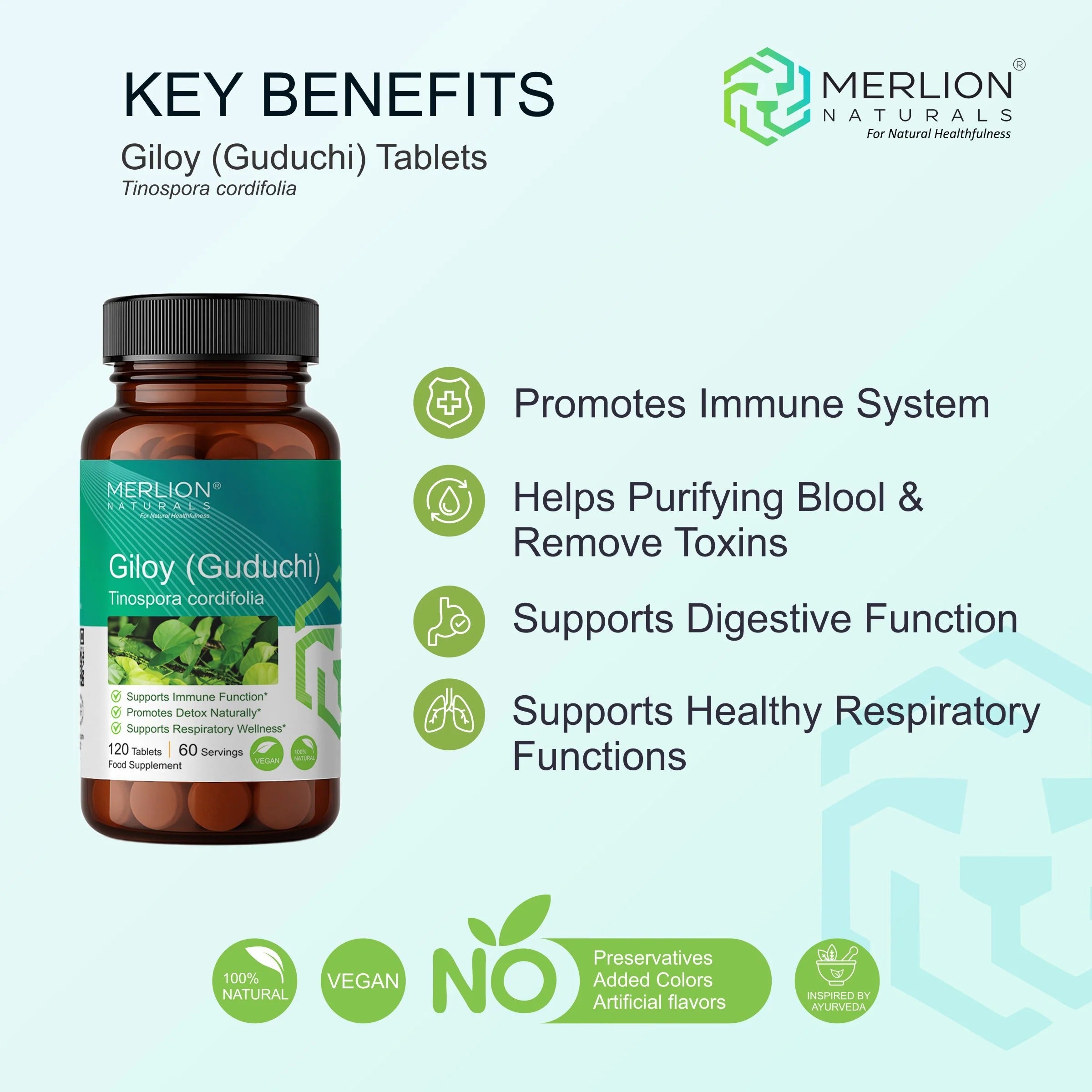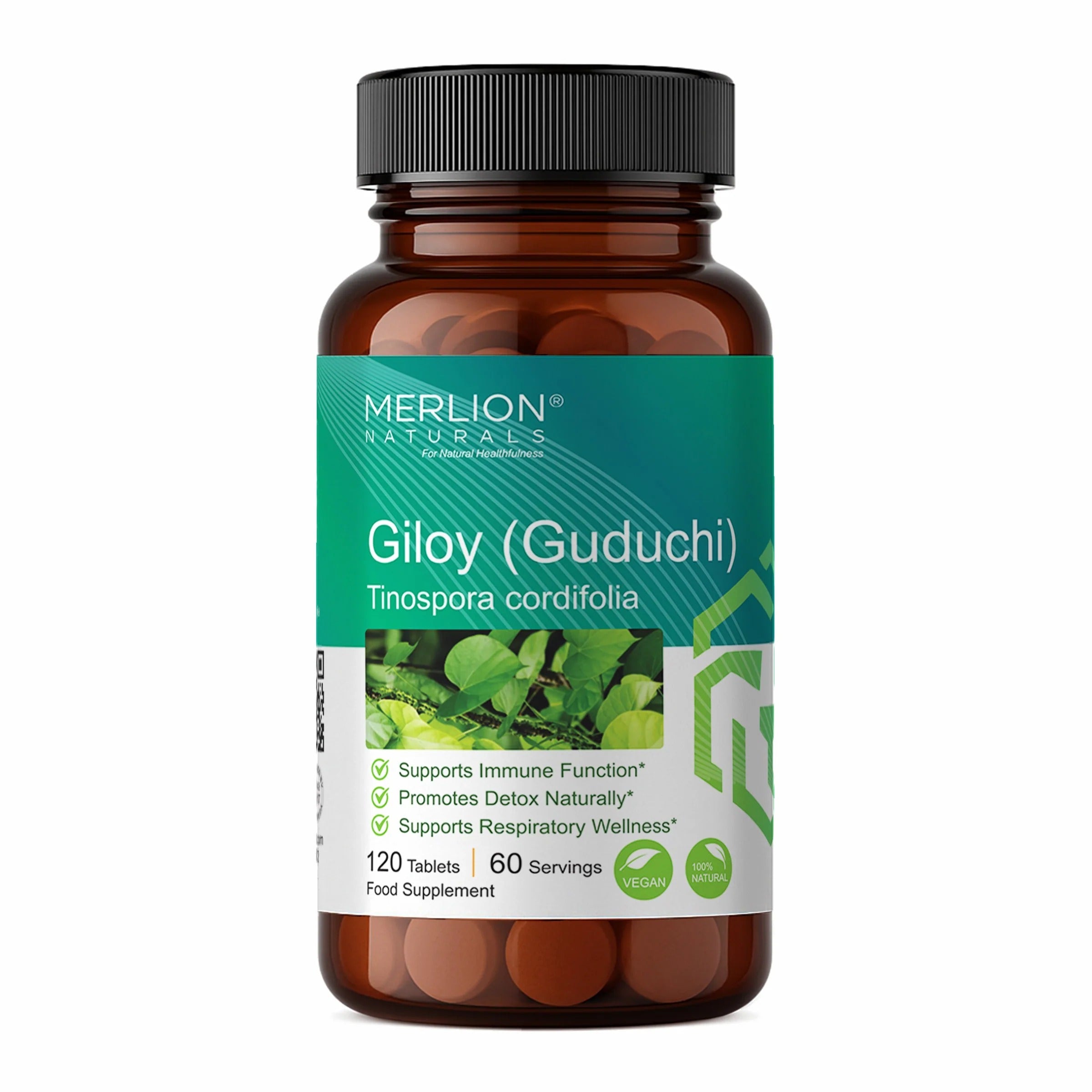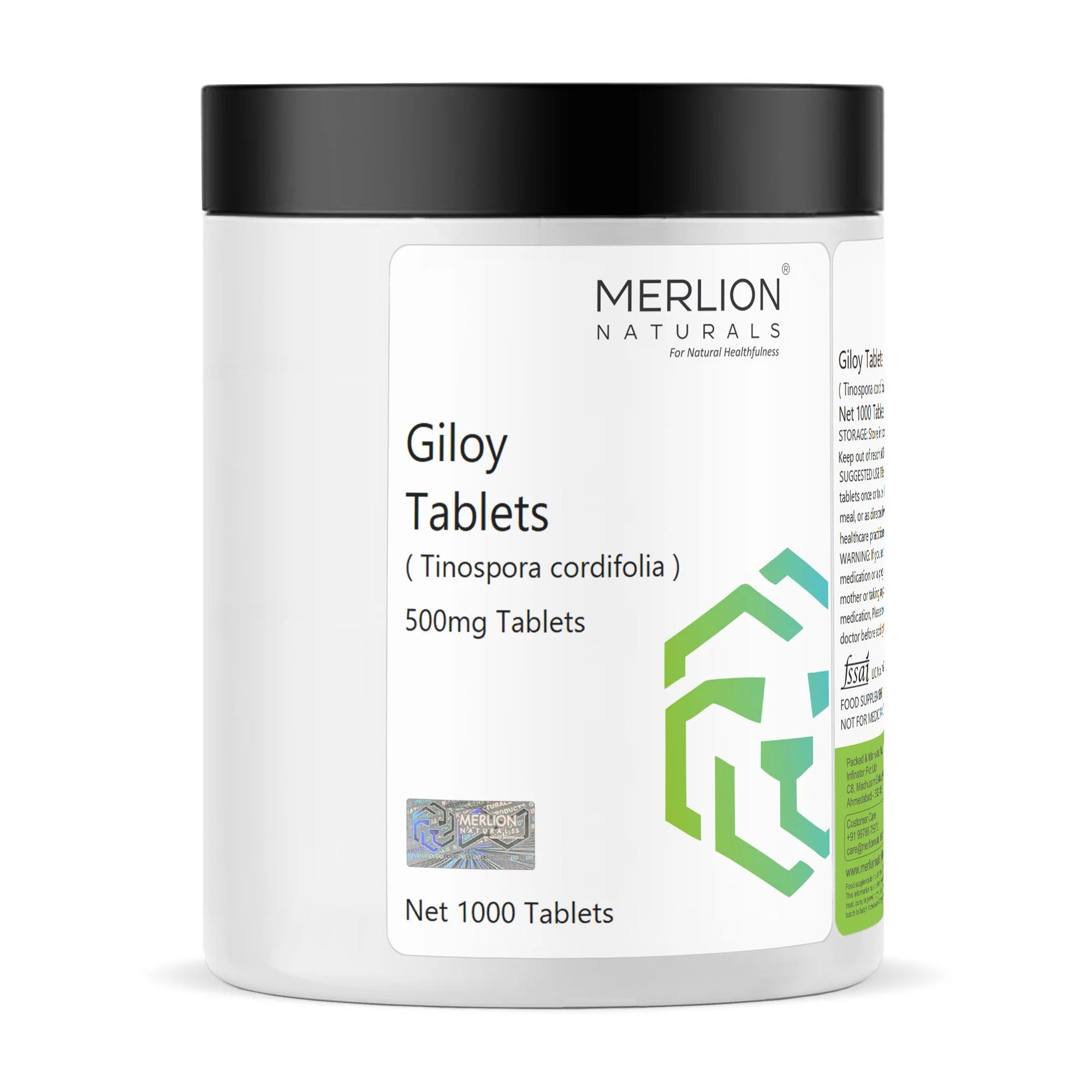- Merlion Naturals Giloy Tablet is a natural herbal supplement and contains the goodness of high quality Giloy ( Tinospora cordifolia ) in form of tablets. Giloy, also known as Amrita or Guduchi in Hindi, is an herb that helps improve digestion and boost immunity. It has heart-shaped leaves that resemble betel leaves.