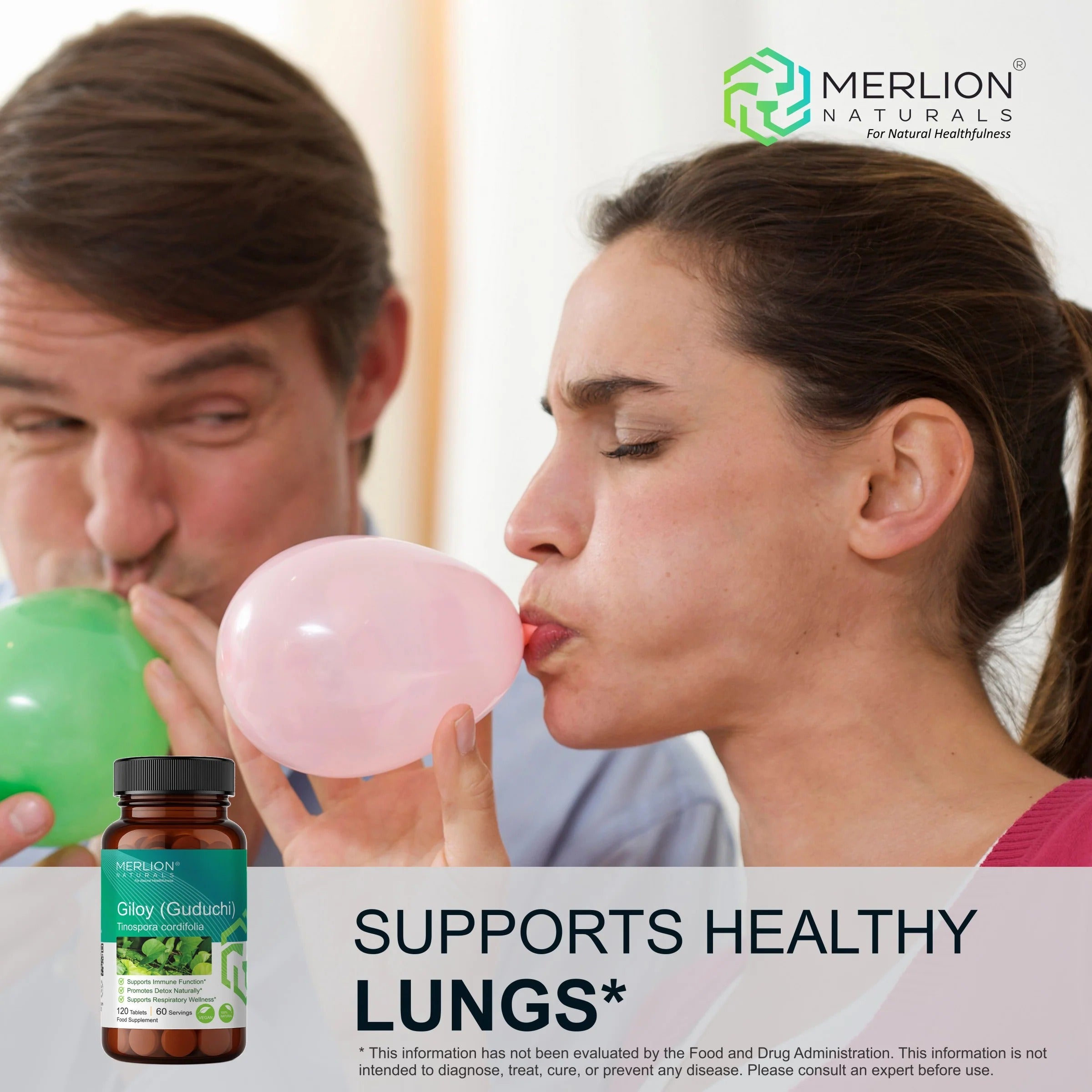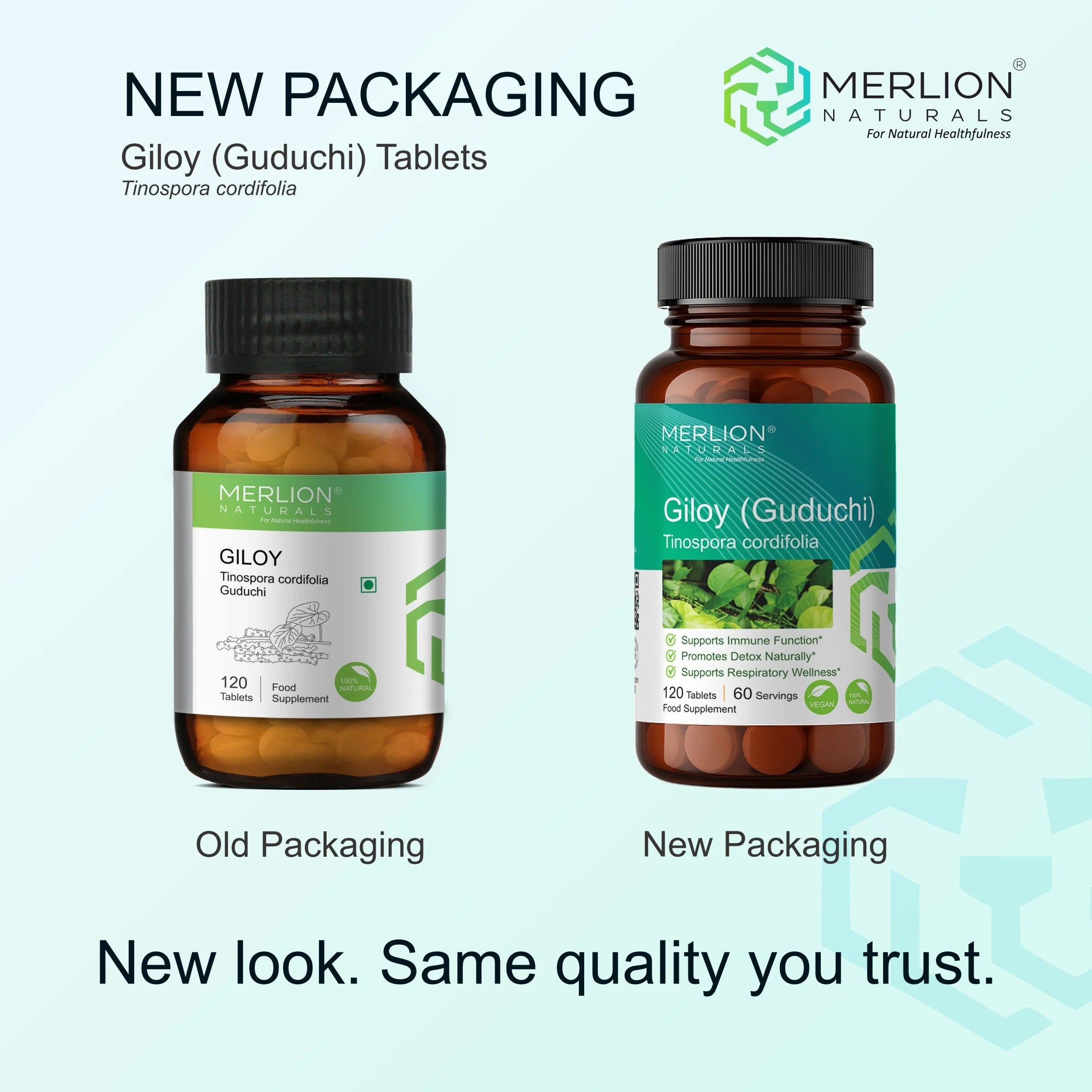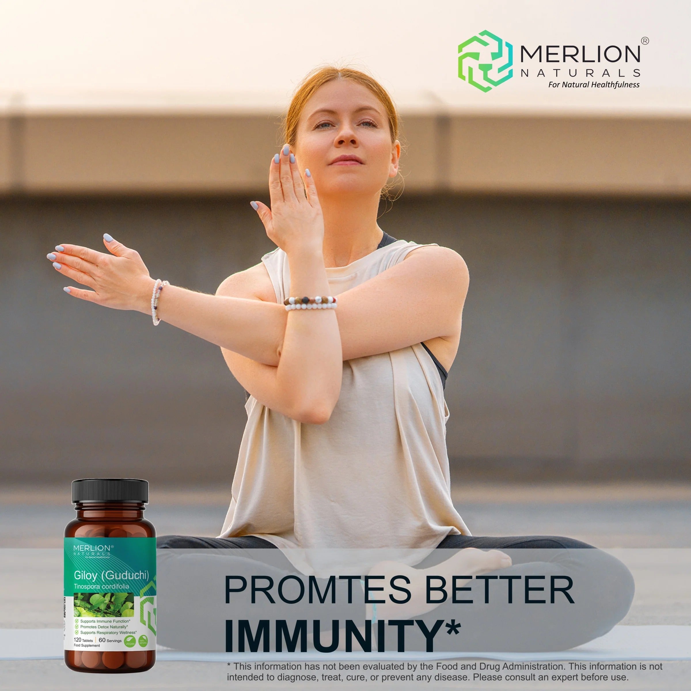 - Merlion Naturals Giloy Tablet is a natural herbal supplement and contains the goodness of high quality Giloy ( Tinospora cordifolia ) in form of tablets. Giloy, also known as Amrita or Guduchi in Hindi, is an herb that helps improve digestion and boost immunity. It has heart-shaped leaves that resemble betel leaves.